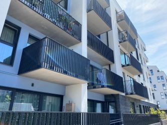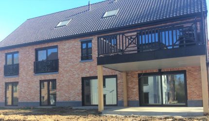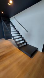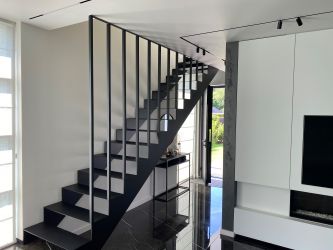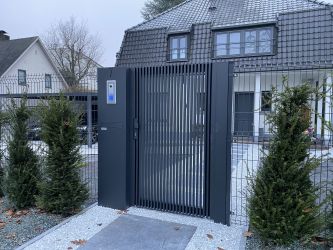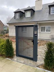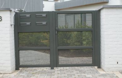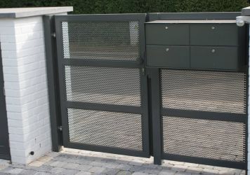 Portillon : modèle : bas plein avec lames verticales soudées et pressées, finition en lames ajourées / Poortje : model : vol bodem, met opengewerkte lamelverdeling